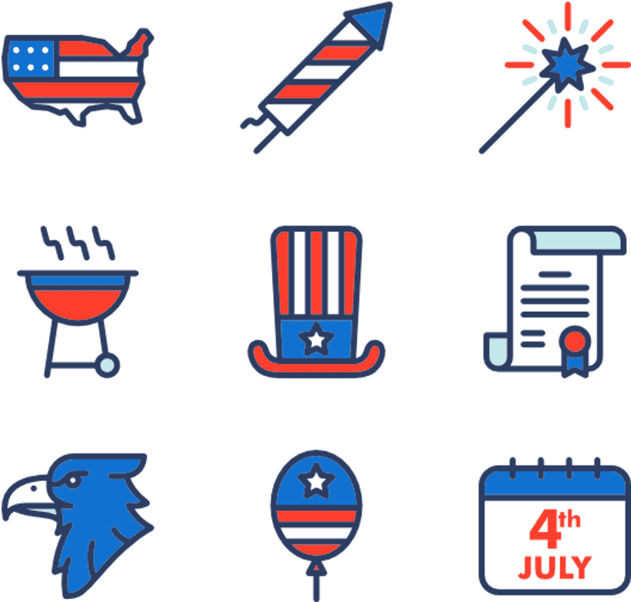 A Collection Of Eight Flat Design Icons Representing 4th Of July Themes, Including The Us Map, Fireworks, Sparkler, Barbecue Grill, Uncle Sam Hat, Declaration Scroll, Eagle Head, Balloon,