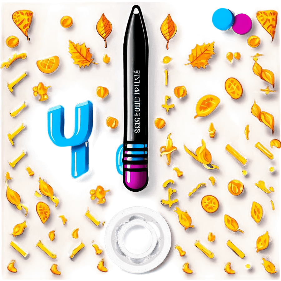 A Colorful Digital Art Piece Featuring A Central Stylized Pen, Surrounded By Various Objects Like Leaves, Pizza Slices, And Letters Against A Textured Background.
