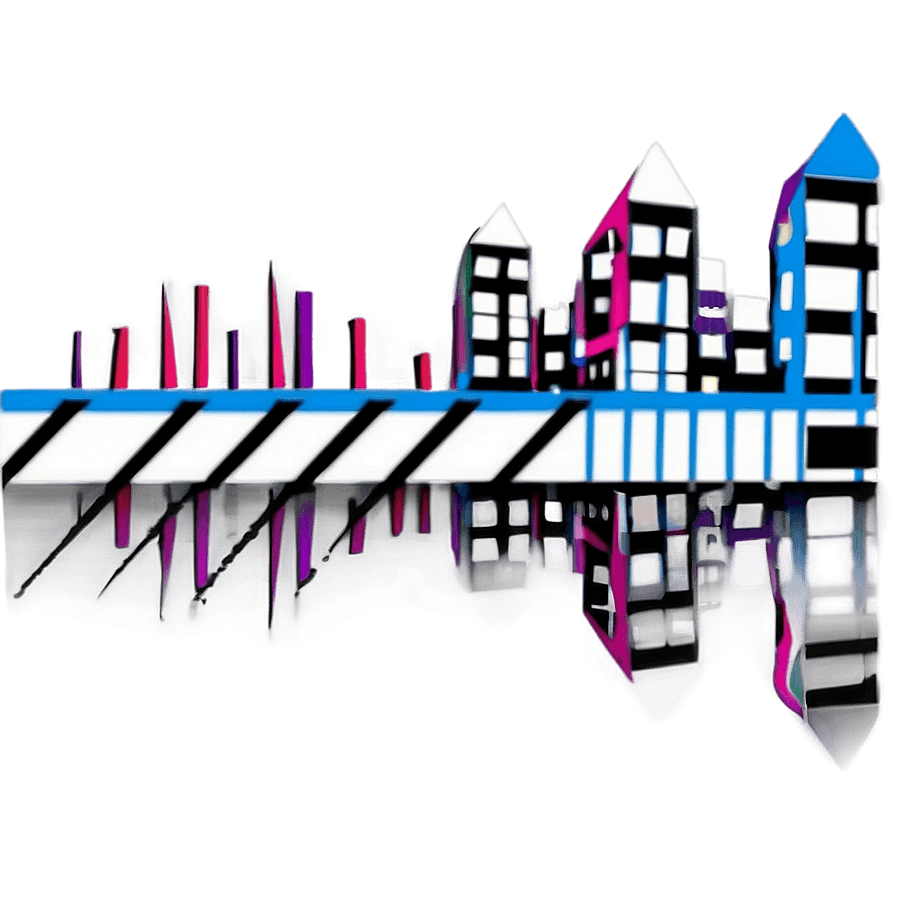 Stylized Vector Illustration Of An Abstract Cityscape With Colorful Buildings And A Striped Overpass, Featuring Reflections On A Dark Surface.
