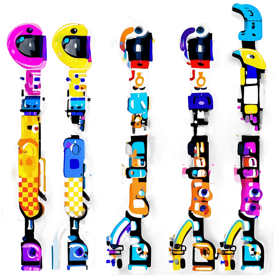 Five Stylized, Colorful Robot Figures In A Row Against A Dark Background, Each With A Unique Design And Vibrant Patterns.