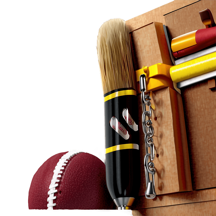 A Collection Of School And Sports Items Including A Paintbrush, Football, Books, And A Flute Against A Wooden Backdrop.