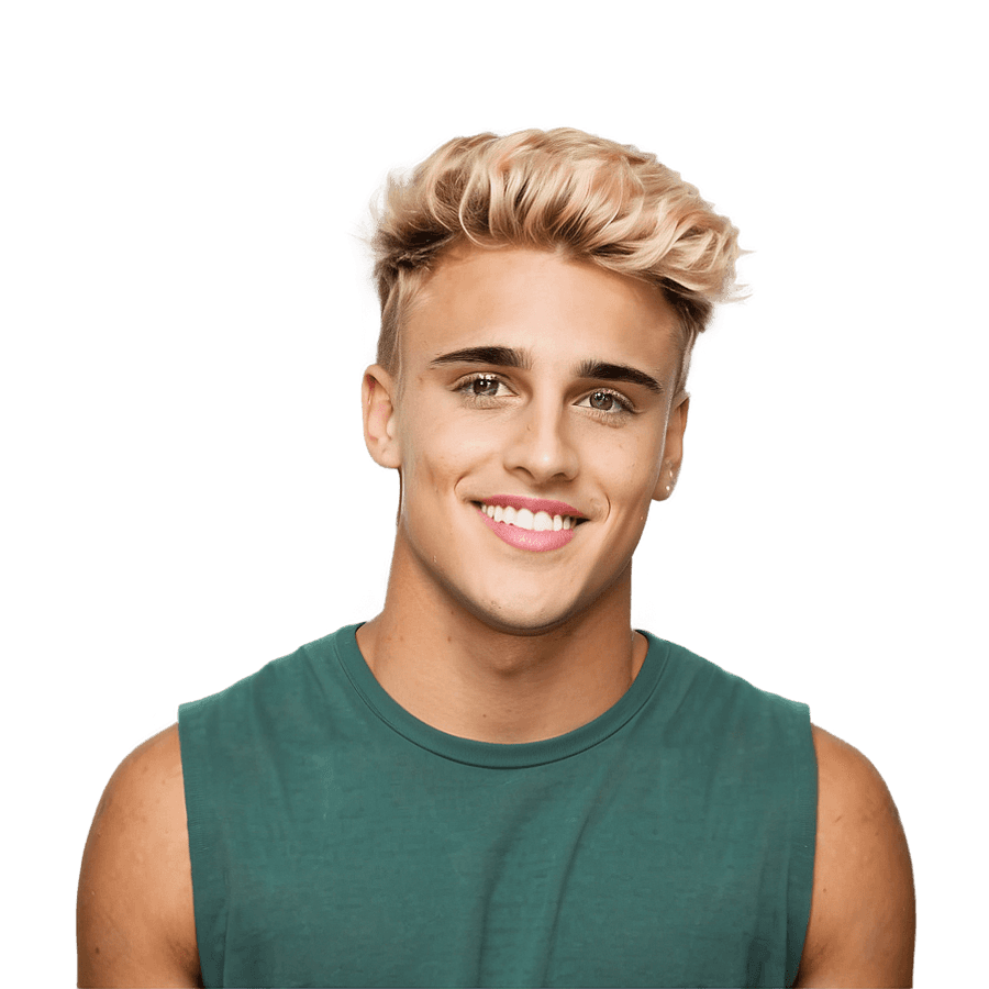 A Young Man With Bleached Blonde Hair And A Sleeveless Green Top Smiles Against A Grey Background.