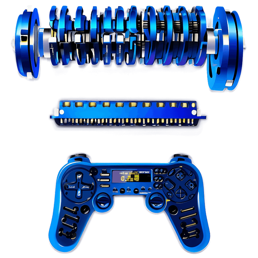 Three Blue Mechanical Objects: A Disassembled Camshaft, A Harmonica, And A Video Game Controller, All Isolated On A Dark Background.