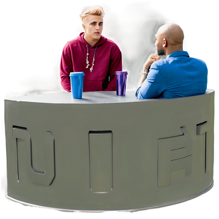 Two Individuals Engaged In Conversation At A Round Table, One With A Pink Hoodie And Blonde Hair, The Other In A Blue Shirt, With Blue Cups On The Table.