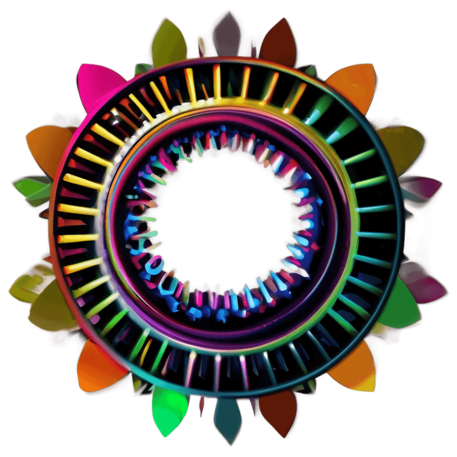 A Vibrant, Multicolored Circular Abstract Art Piece With A Variety Of Shapes And A Glowing, Neon-like Center On A Grey Background.