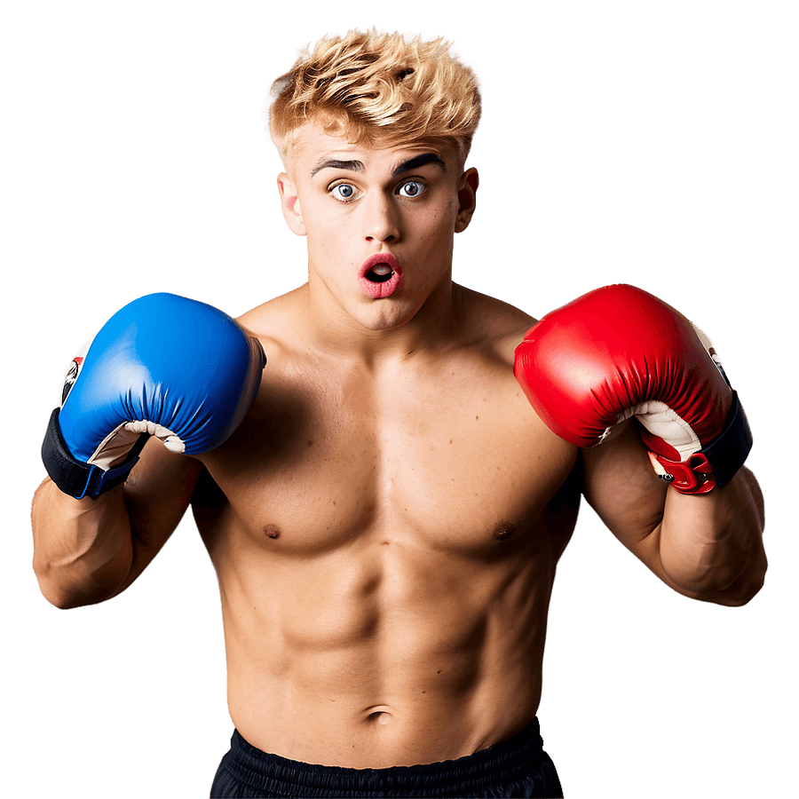 A Shirtless Man With Blond Hair Wearing Blue And Red Boxing Gloves, Looking Surprised Against A Grey Background.