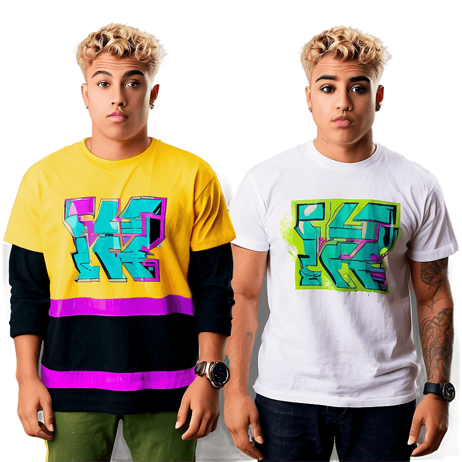 A Person With Two Different Outfits, One In A Yellow Graphic Sweatshirt And The Other In A White Graphic Tee, Both With Similar Hairstyles And Tattoos, Against A Grey Background.