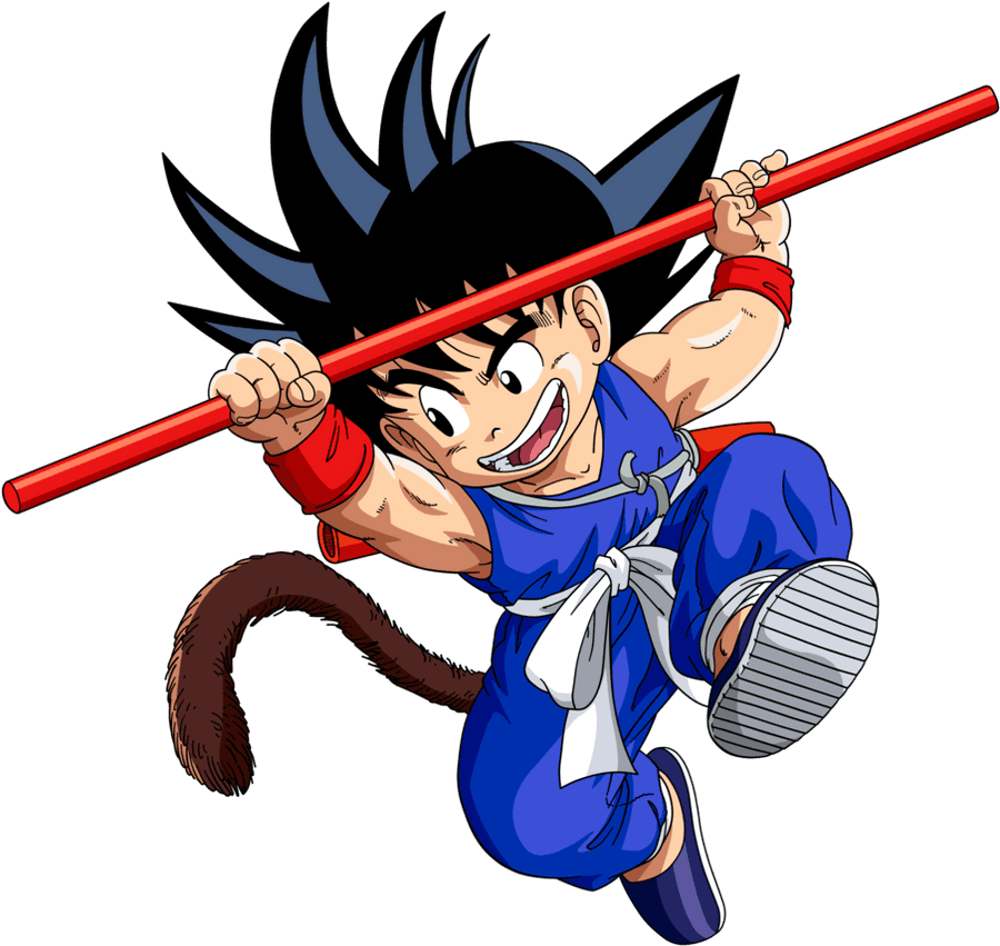 Animated Character Kid Goku From Dragon Ball, Holding Power Pole, With A Tail, Wearing Blue And White Outfit, On A Grey Background.