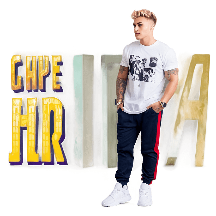 A Man With Styled Hair And Tattoos Stands Confidently, Wearing A White Graphic T-shirt, Navy Pants With A Red Stripe, And White Sneakers, Against A Graffiti-style Text Backdrop.