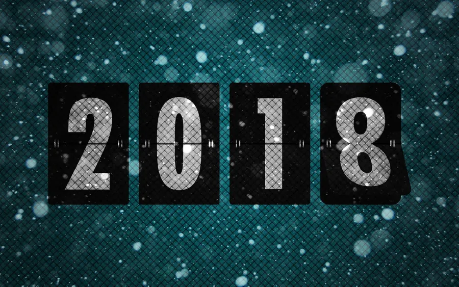 Four Flip Clock Panels Against A Blue Pixelated Background With Snowflakes, Displaying The Year 2018.