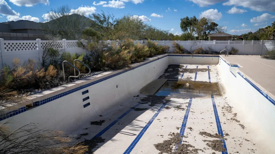 An Empty Abandoned Pool With Cracked Surfaces And Debris, Surrounded By Overgrown Vegetation And A White Fence Under A Clear Blue Sky.