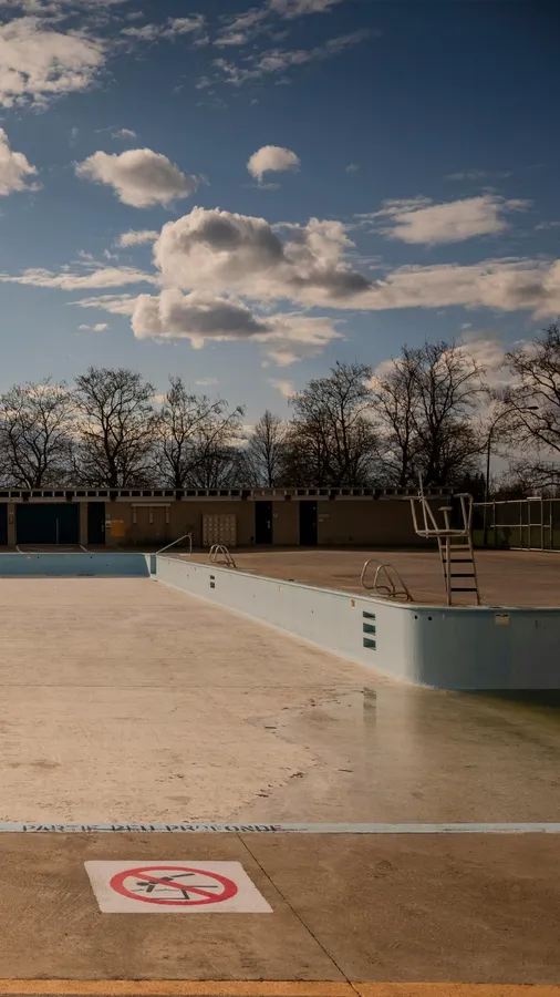 An Empty, Neglected Outdoor Pool Under A Cloudy Sky With Leafless Trees In The Background, Showing Signs Of Disuse And Abandonment.