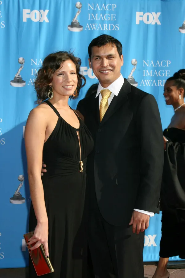 A Couple Poses On The Red Carpet, The Man In A Black Suit And Gold Tie, The Woman In A Black Dress, At The Naacp Image Awards.