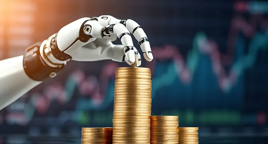 Robot,coins,ai,finance,graph,economy,technology,futuristic,digital,stock,automation,innovation,trading,market,hand