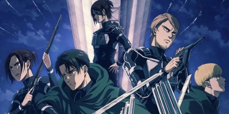 Four Animated Characters In Military Uniforms With Weapons, Poised Against A Night Sky Backdrop, Representing The Scout Regiment From "attack On Titan".