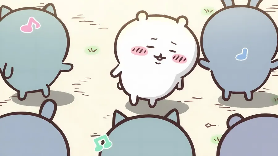 Cute Chiikawa Characters Enjoy Dancing Together Outdoors In A Playful Scene Full Of Joy And Music Notes