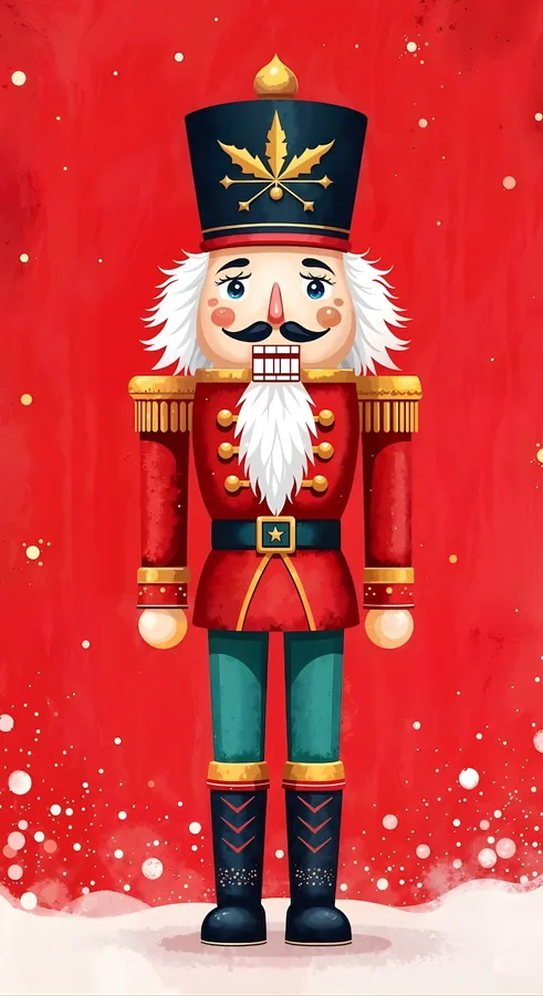 Traditional Nutcracker Figure Dressed In Red And Green With A Tall Black Hat, Standing Against A Festive Red Background With Snow Accents.