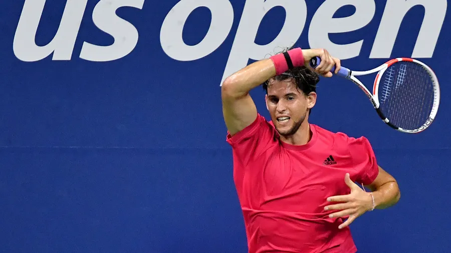 A Tennis Player In A Red Shirt And Navy Shorts Mid-swing With A Blue "us Open" Backdrop.