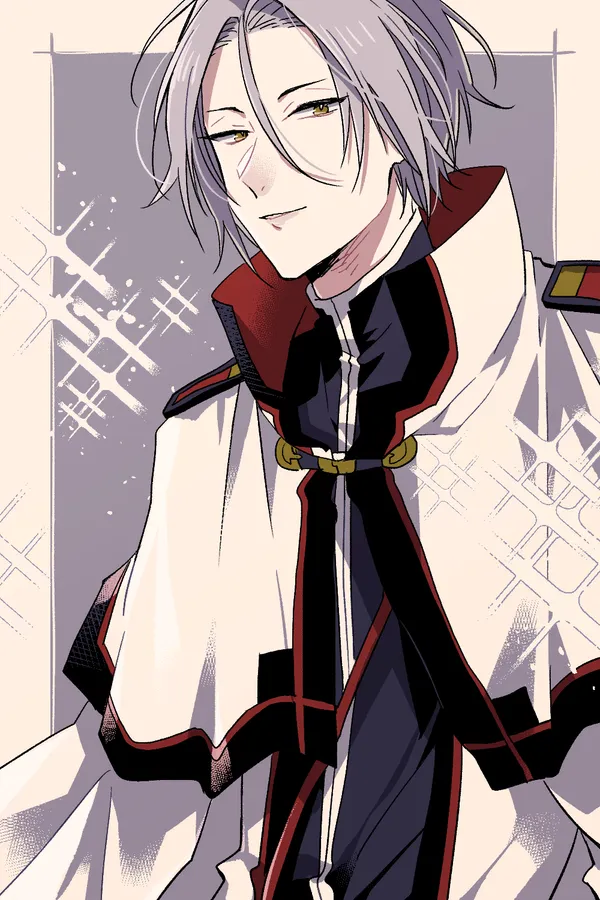 A Stylized Illustration Of An Anime Character With Silver Hair And Yellow Eyes, Wearing A Red And Black Outfit With A White Cape, Against A Patterned Background.