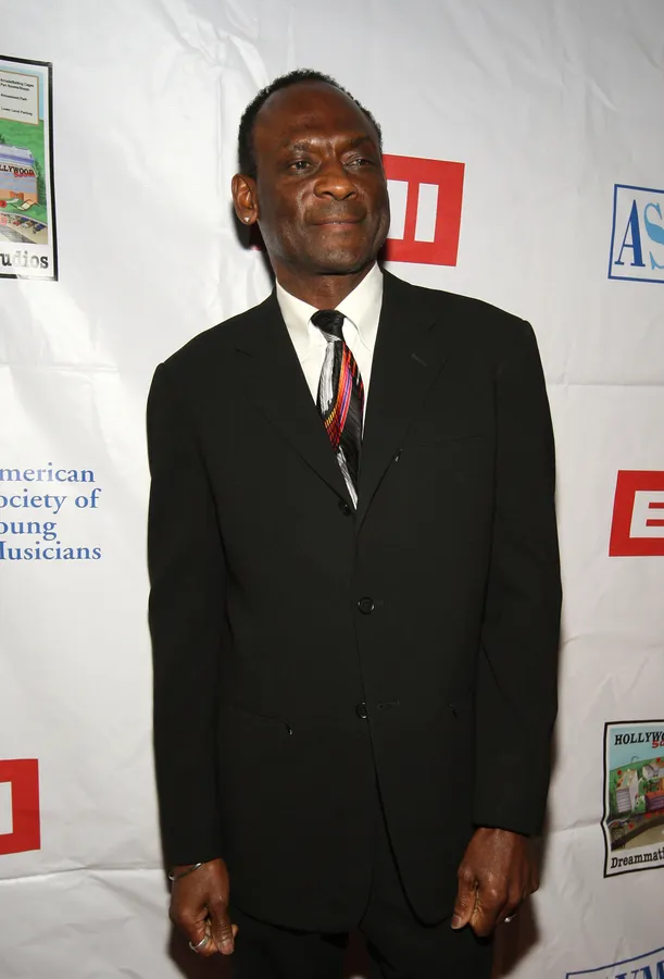 A Man In A Black Suit And Striped Tie Stands Against A Backdrop With Logos, Smiling Slightly.