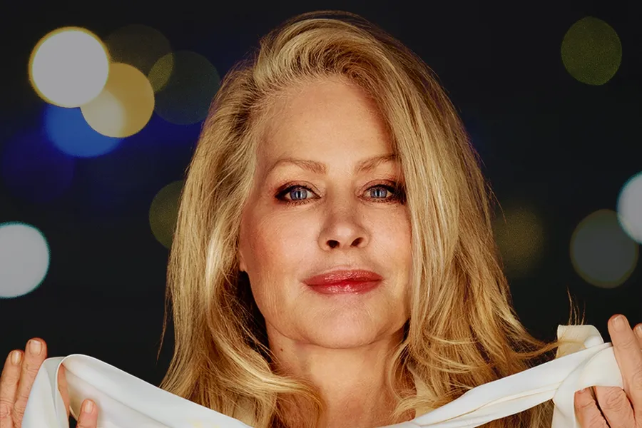 A Woman With Blonde Hair Holds A White Scarf, With A Bokeh Light Effect In The Background.