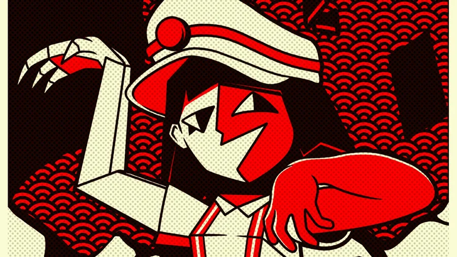 Stylized Ena Character In Red And Black Performing A Dynamic Pose With A Patterned Background.