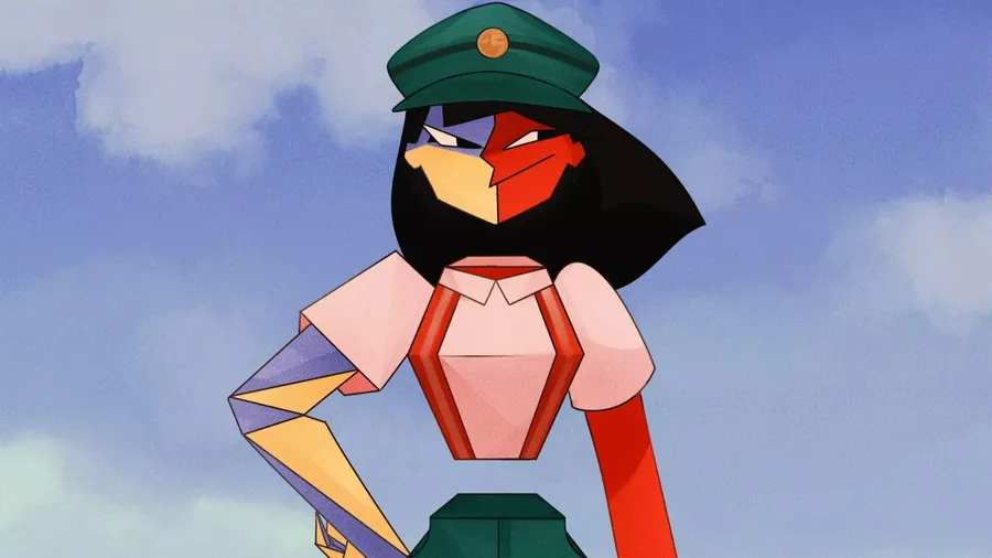 Ena Is A Stylized Animated Character Featuring Geometric Shapes And Vibrant Colors, Wearing A Green Cap And A Pink Outfit Against A Blue Sky Background.