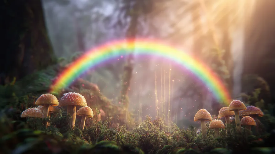Fantasy,forest,rainbow,mushrooms,glowing,mystical,enchanted,nature,light,ethereal,dreamlike,woodland,wonder,fairytale,magic