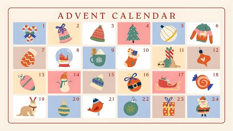 Colorful And Playful Advent Calendar Featuring Holiday Icons And Numbered Doors For A Joyful Countdown To Christmas.