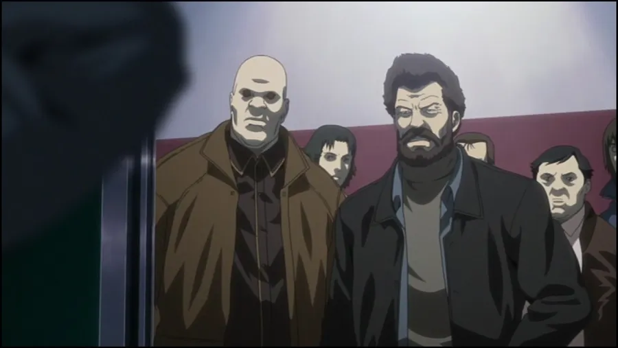 Animated Characters From "ghost In The Shell" Stand In A Group, With Ishikawa Prominently In The Center, Surrounded By His Team Members.