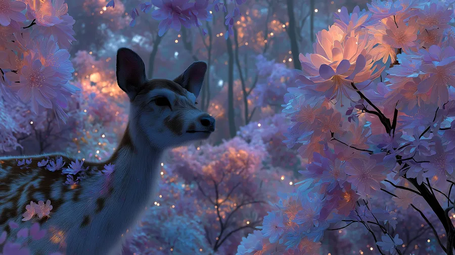 Fantasy,deer,magical,forest,glowing,nature,dreamlike,surreal,enchanted,animal,whimsical,spiritual,mystical,floral,luminescent