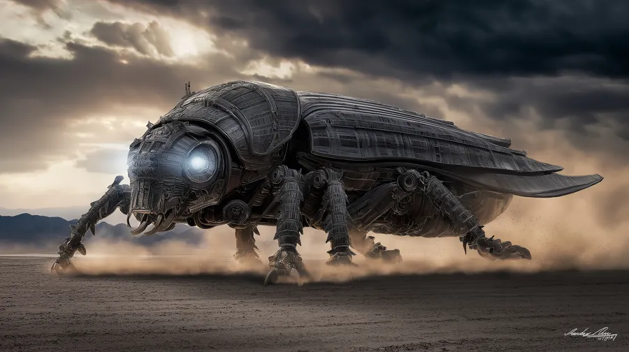 Robot,beetle,mechanical,futuristic,desert,sciencefiction,cyberpunk,creature,dystopian,fantasy,postapocalyptic,machinery,tech,alien,wilderness
