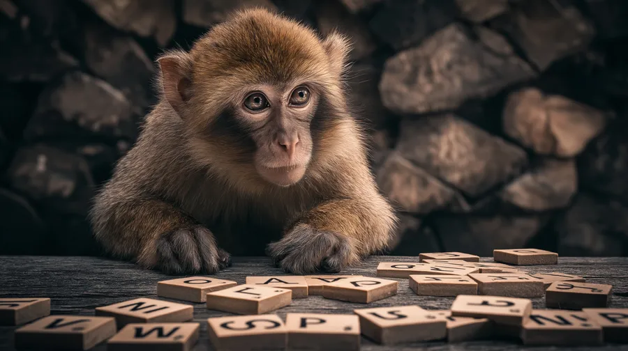 Primate,monkey,curious,letters,tiles,scrabble,animal,contemplative,rustic,wooden,thinking,intelligent,cute,wildlife,learning