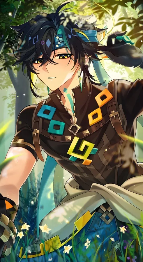 Kinich Stands In A Sunlit Forest, Adorned With Vibrant Geometric Accessories And A Thoughtful Expression, Blending Nature And Mysticism.