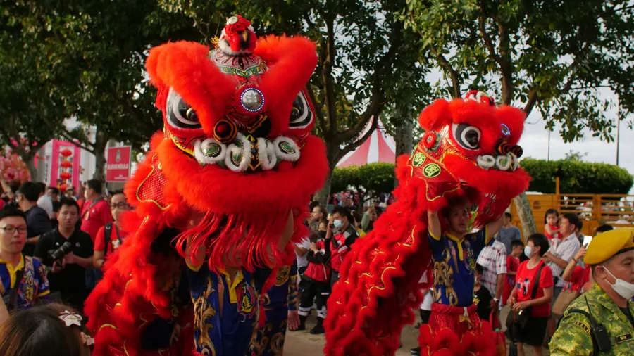 Vibrant Red Lion Dance Costumes Captivate Crowd During Festive Outdoor Celebration