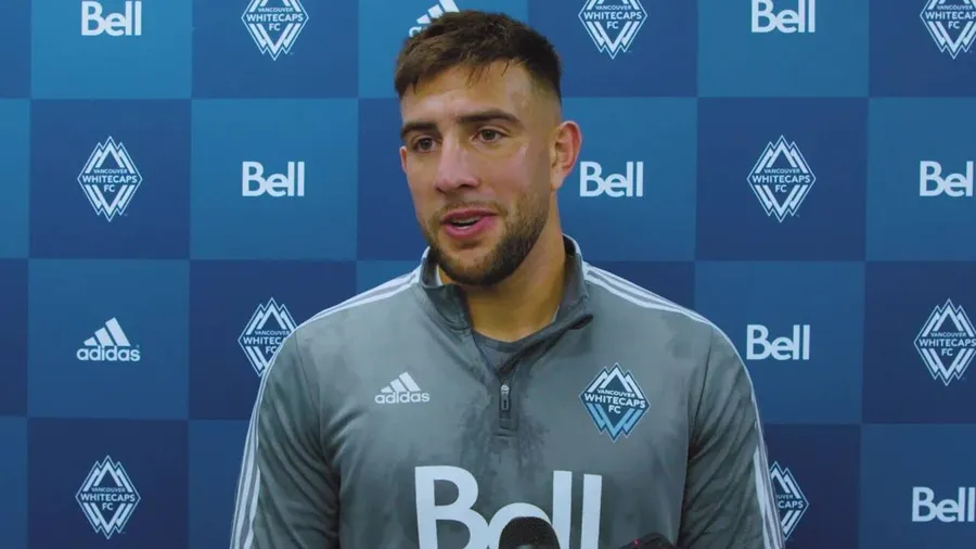 A Man In A Grey Adidas Sports Jacket Stands In Front Of A Backdrop With Vancouver Whitecaps Fc Logos.