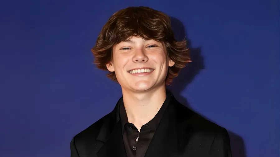 Maddox Batson Poses Confidently In A Black Suit Against A Blue Background, Showcasing His Youthful Charm And Style.