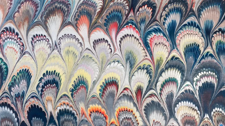A Vibrant Marbleized Design Featuring Feather-like Shapes In Soft Blues, Reds, Yellows, And Grays Creating A Dynamic And Flowing Abstract Texture.
