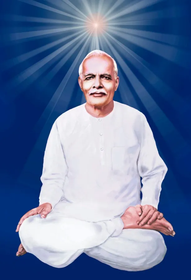 A Person In White Clothing Sits Cross-legged, With A Radiant Light Emanating From The Head Against A Blue Background.