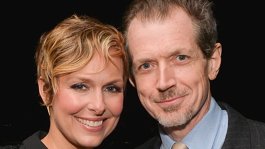 A Smiling Woman With Short Blonde Hair, Wearing Earrings And Makeup, Poses Closely With A Man Who Has Grey Hair And A Goatee, Both Dressed In Formal Attire.