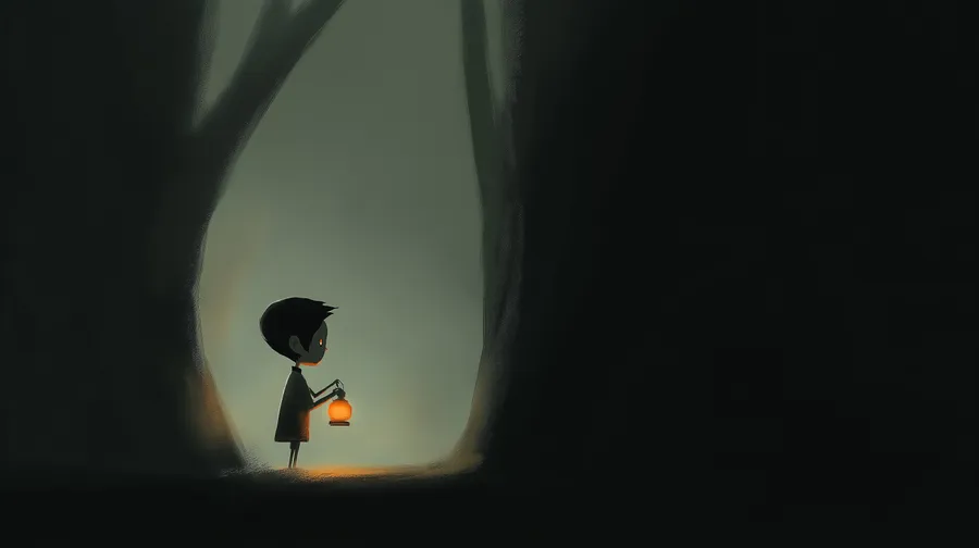 Child,lantern,silhouette,forest,dark,mystery,minimalist,solitude,fear,hope,simplistic,shadow,concept,illustration,alone