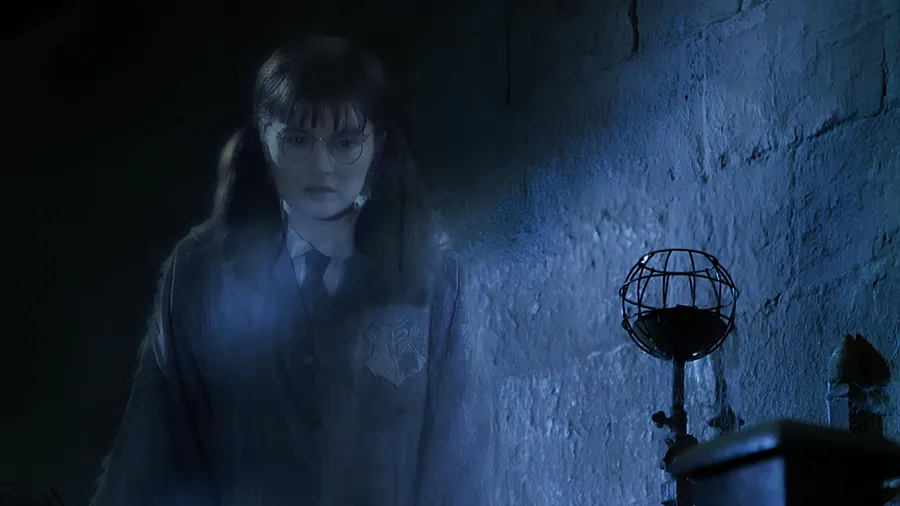 Moaning Myrtle Haunts The Hogwarts Bathroom, Appearing As A Translucent Ghost With A Sorrowful Expression And Ethereal Glow.