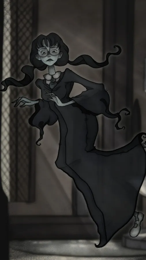 Dark Eerie Depiction Of Moaning Myrtle With Flowing Hair And Haunting Expression In A Shadowy Setting.