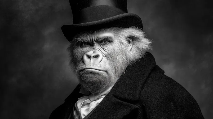 Gorilla,monochrome,portrait,tophat,coat,animal,distinguished,vintage,classic,wildlife,expression,formal,character,blackwhite,gentleman
