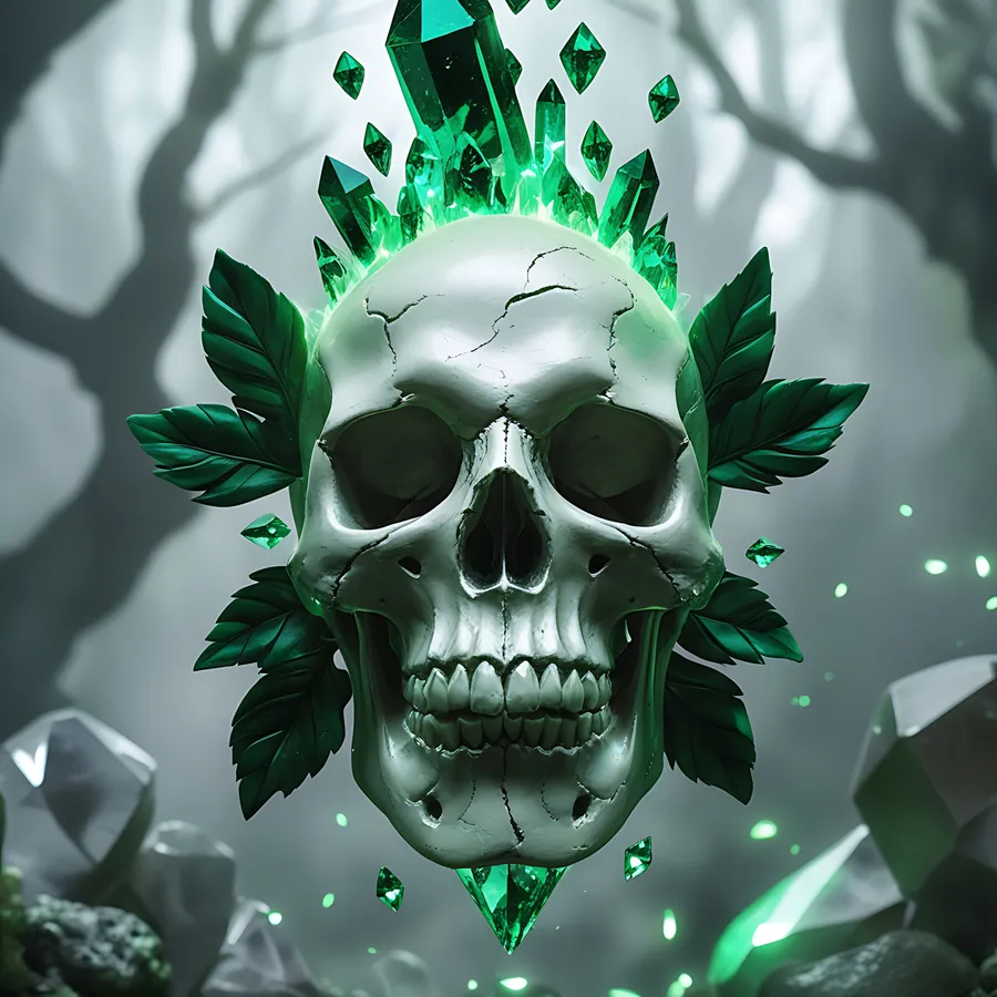 Scary,skull,crystals,leaves,green And Black,decor,gothic,mystical,eerie,haunted,supernatural,spectral Glow,arcane,horror