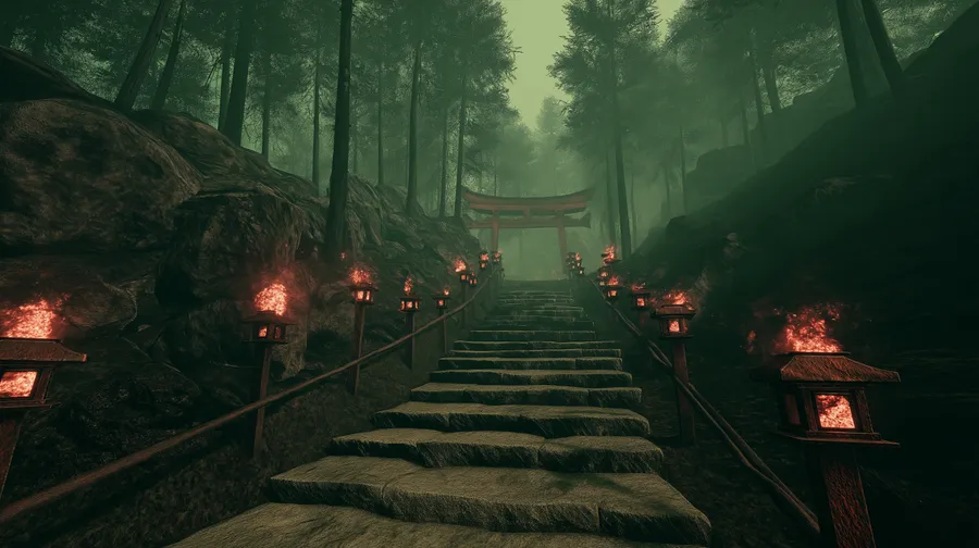Fantasy,forest,path,lanterns,shrine,mystical,fog,nature,ancient,spiritual,gateway,serene,journey,woodland,ethereal