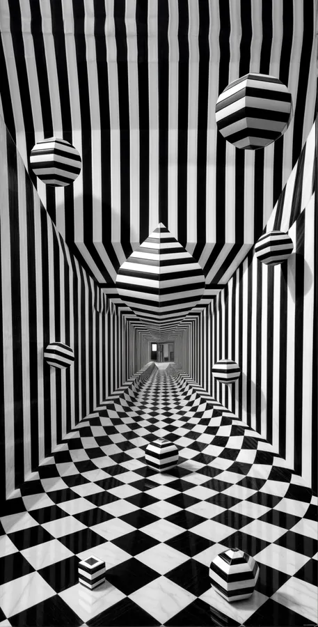 Optical,illusion,blackandwhite,floating,3d,shapes,vortex,striped,spheres,cubes