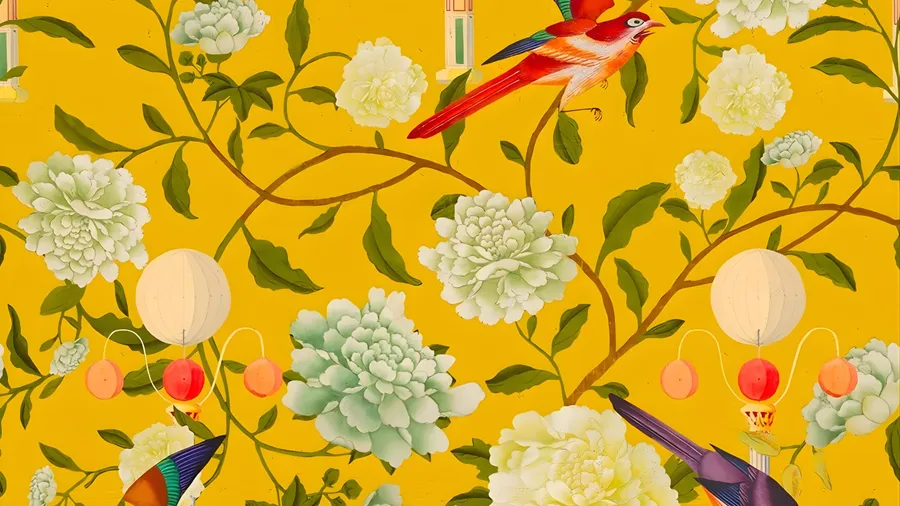 Vibrant Oriental Design Featuring Delicate Flowers, Birds, And Lanterns On A Rich Yellow Background, Showcasing Traditional Elegance And Intricate Detailing.