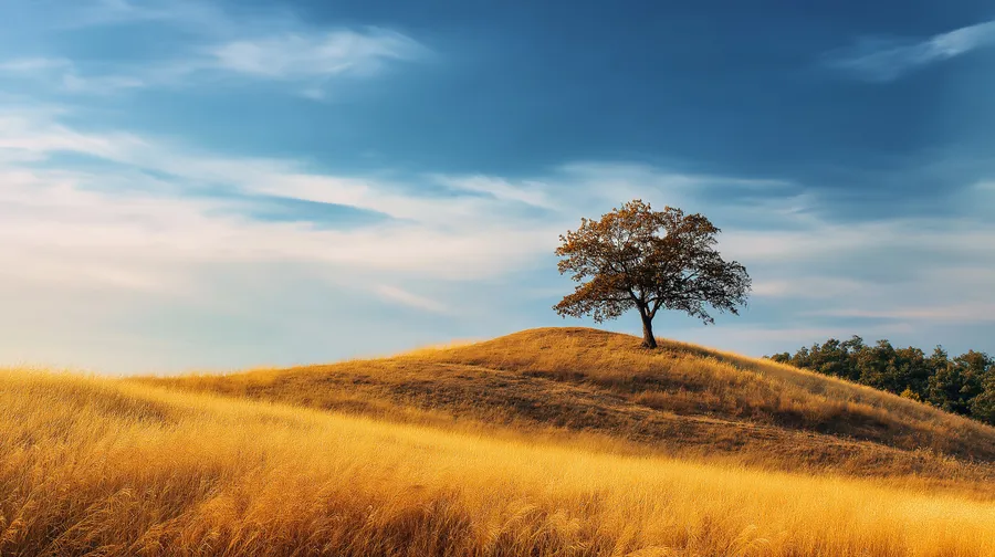 Tree,nature,landscape,hill,golden,grass,panoramic,solitary,outdoor,scenic,tranquil,sky,field,countryside,serene