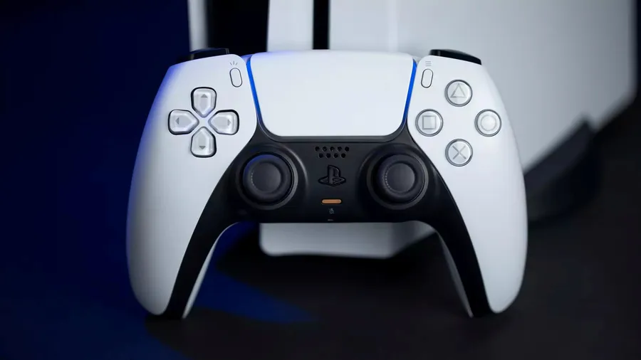 Close Up Of A White And Black Ps5 Controller Showing Buttons And Analog Sticks On A Dark Surface With A Blurred Background.